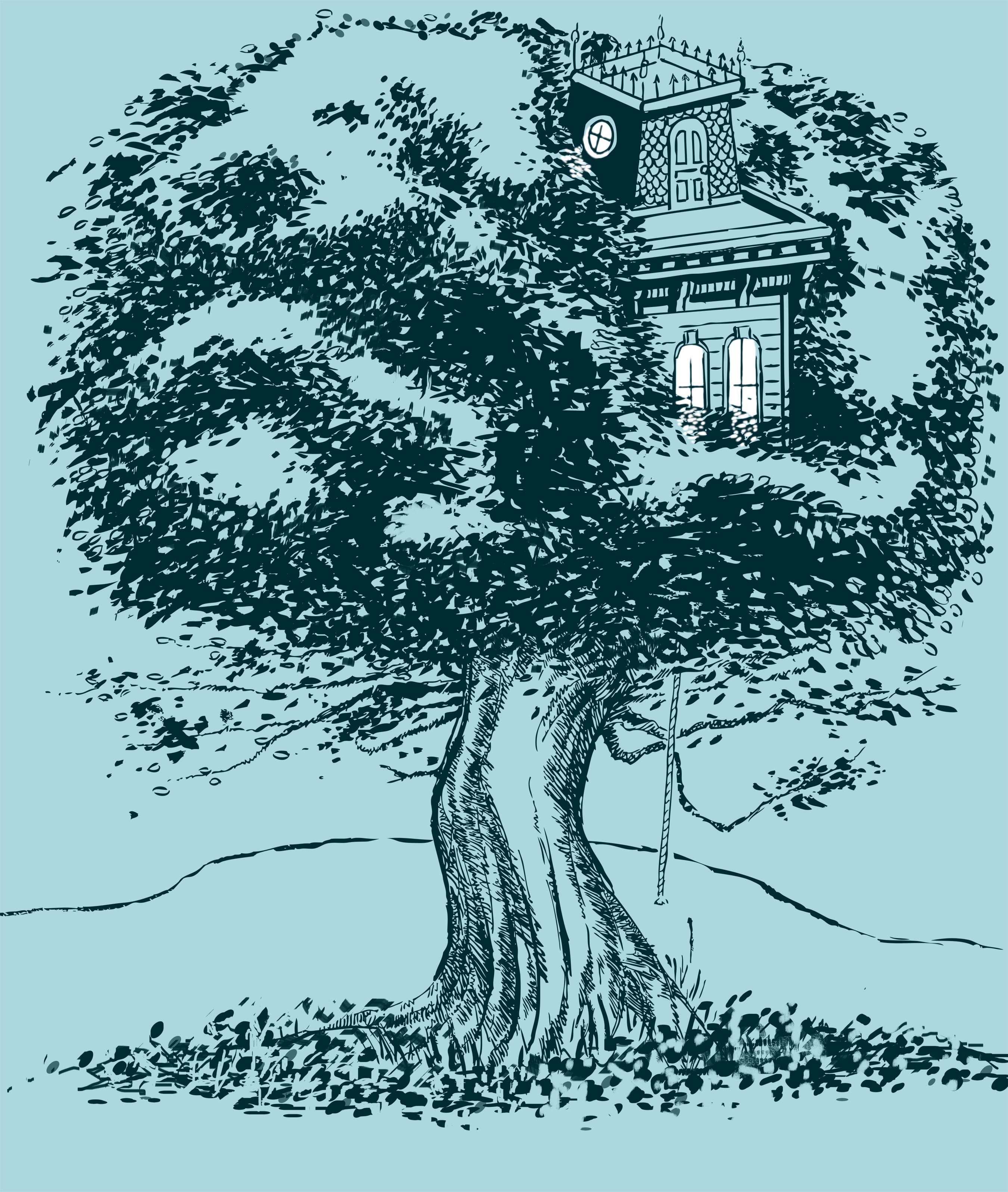 As they walked into the clearing, Gordo noticed a light coming from the branches of a large tree. He looked up and saw the light came from a window in what appeared to be a tree house. As his eyes became more adjusted to the light, he was amazed by the apparent size of the house hidden in the leaves of the old majestic tree.